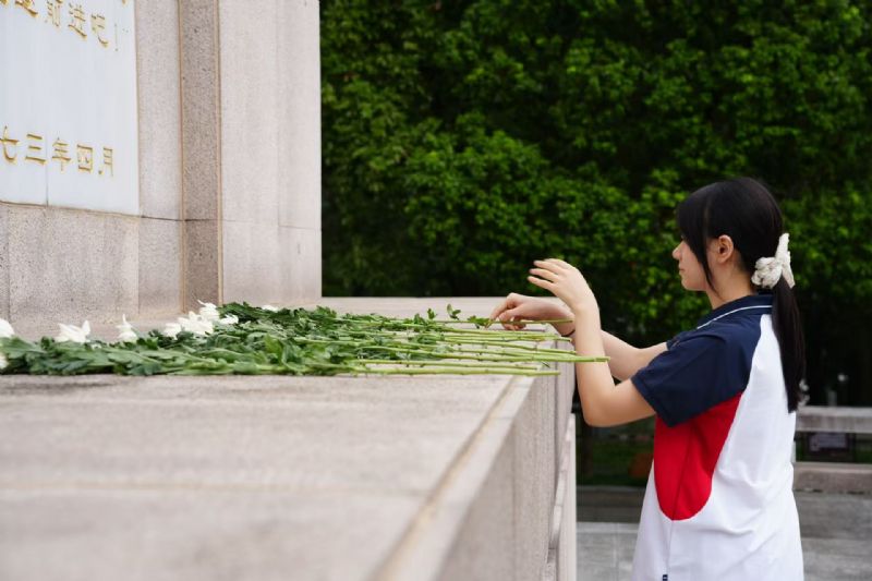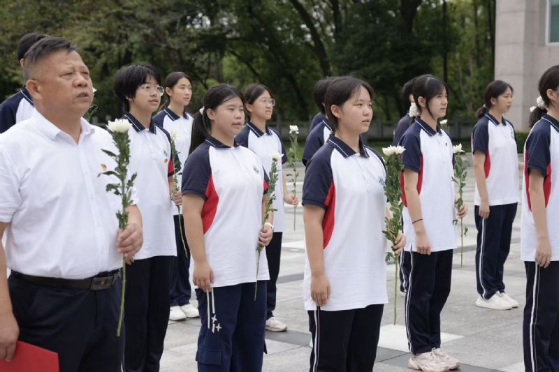 全體師生肅立,伴隨著激昂的旋律高唱國(guó)歌,嘹亮的歌聲滿含對(duì)先烈的深深敬意。