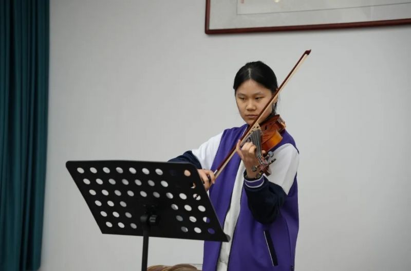 座談間隙,學(xué)生們的精彩表演讓現(xiàn)場溫情再升級(jí):206班盧雨萱的古箏獨(dú)奏《春江花月夜》,弦音裊裊、古韻悠長;207班譚力的獨(dú)唱《心中的日月》,歌聲清澈、滿含敬意;208班劉彩雯的小提琴獨(dú)奏《月半小夜曲》,旋律流轉(zhuǎn)、祝福暗藏。孩子們專注的神情、真摯的情感,贏得老教師們陣陣掌聲。