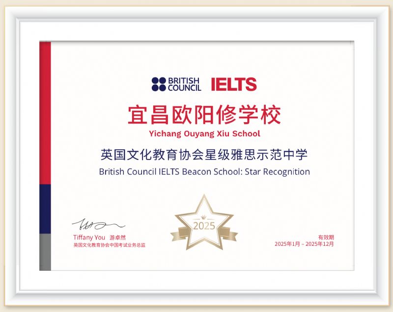 宜昌歐陽(yáng)修學(xué)校現(xiàn)設(shè)有普通高中和國(guó)際高中。20多年來(lái),學(xué)校先后獲得“宜昌市區(qū)域現(xiàn)代化先進(jìn)學(xué)?!?、“宜昌市優(yōu)秀民辦學(xué)校”等諸多榮譽(yù)稱號(hào),是宜昌市唯一被英國(guó)文化教育協(xié)會(huì)BritishCouncil授牌的“星級(jí)雅思示范中學(xué)”、“雅思教師培訓(xùn)基地”和“Aptis普思考點(diǎn)示范學(xué)?!薄ⅰ叭龒{大學(xué)外國(guó)語(yǔ)學(xué)院學(xué)科教學(xué)英語(yǔ)研究生工作站”。2023年7月,中國(guó)工程院院士,香港中文大學(xué)(深圳)校長(zhǎng)徐楊生先生為宜昌歐陽(yáng)修學(xué)校題寫校名。